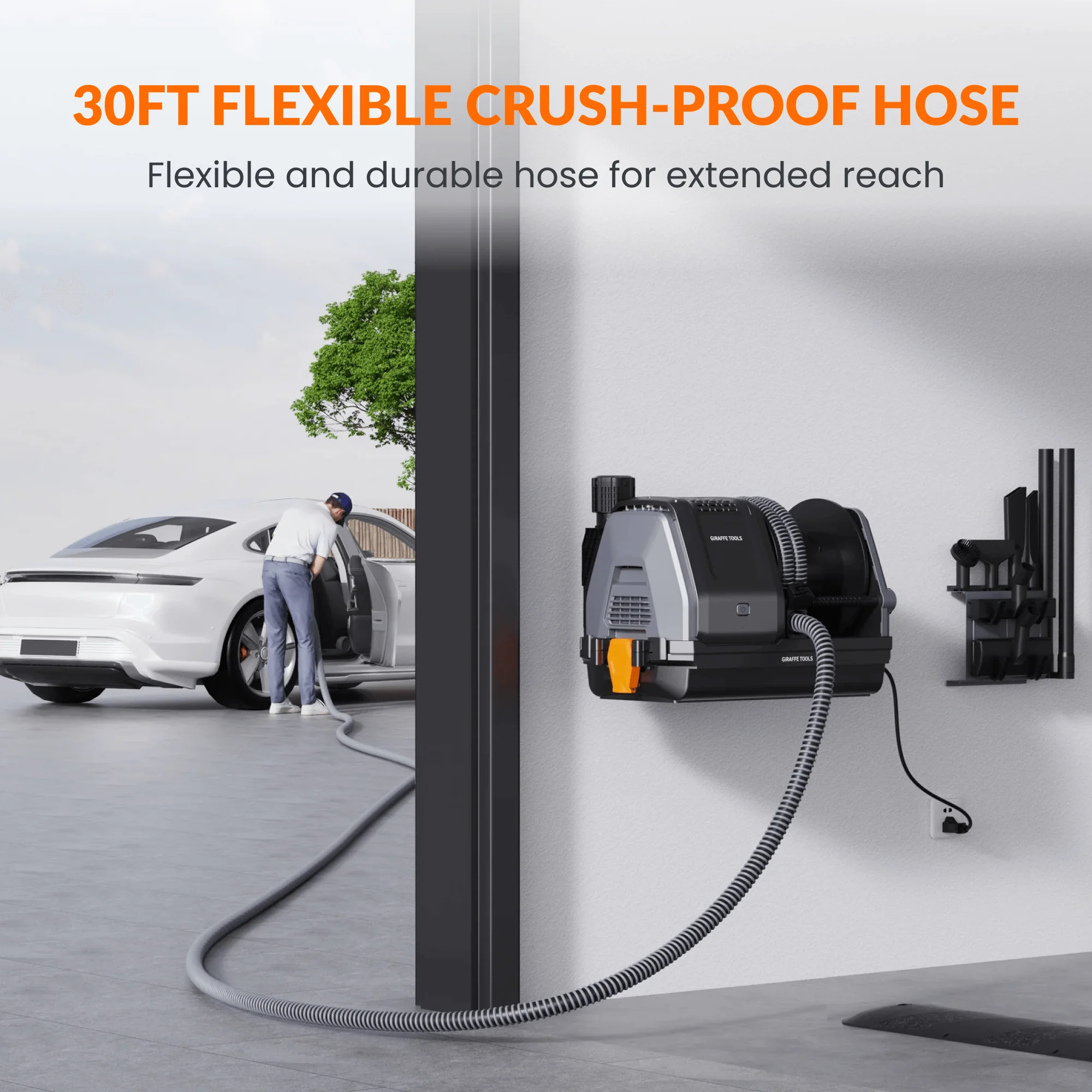 Vacuum with ease, store with breeze and effortlessly have it all in one. Stylish and space-saving, the wall-mounted design facilitates every use. With a 30ft hose, effortlessly reach every corner -simply pull it out for instant use. Wet/Dry Use, Versatile Clean. Breezy Retraction, Automatically Tidy.