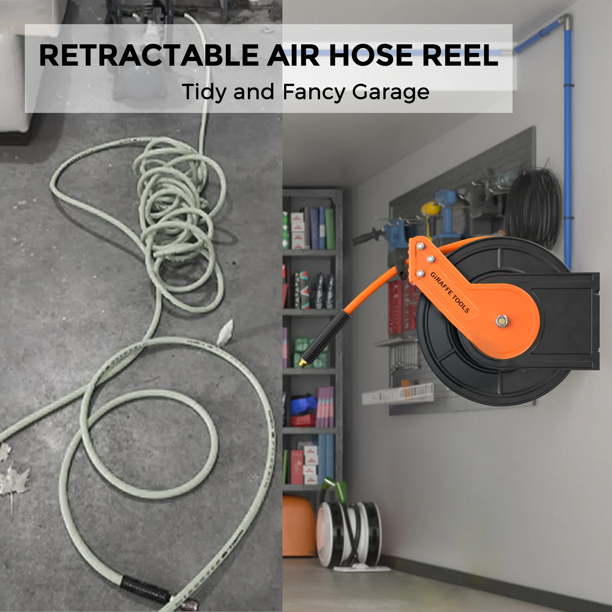 Giraffe Tools air compressor hose reel has a professional-grade all-steel construction, and a corrosion-resistant powder coat finish for long life and durability.